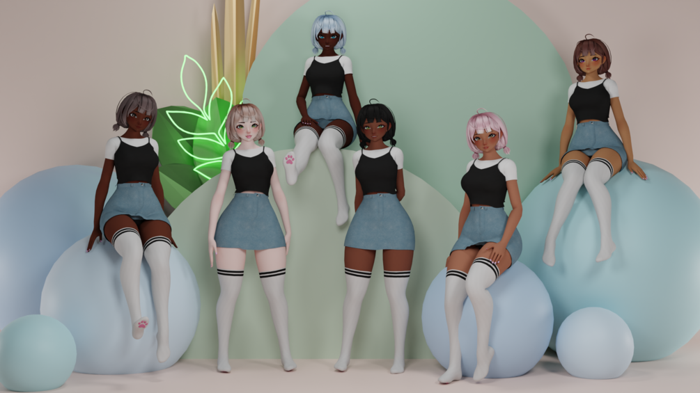 She comes with 6 skin tones, 5 eye colors n her hair uses Wetcats textures (I included a few options). These options all come as ready-to-use materials that u just need to drop in the correct spots c: I also left 2 materials for the denim skirt as I couldn't decide between the darker or lighter shade for it.