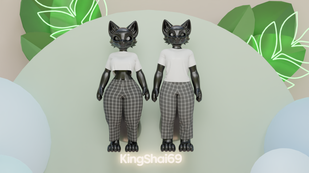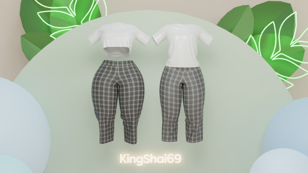 Tshirt comes only in white but uvmapped for easy recolor. pants come in black, red, blue+purple.